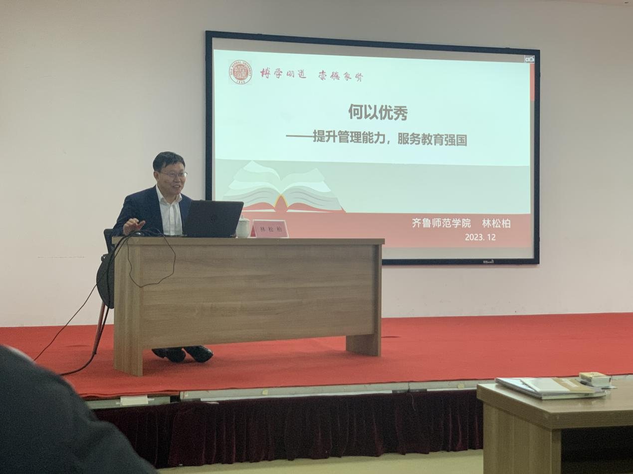 随后,林松柏以《何以优秀——提升管理能力,服务教育强国》为题,从建设教育强国、回归教育本质、明确工作规则、创新理念方法四个层面为参训学员作了专题报告。