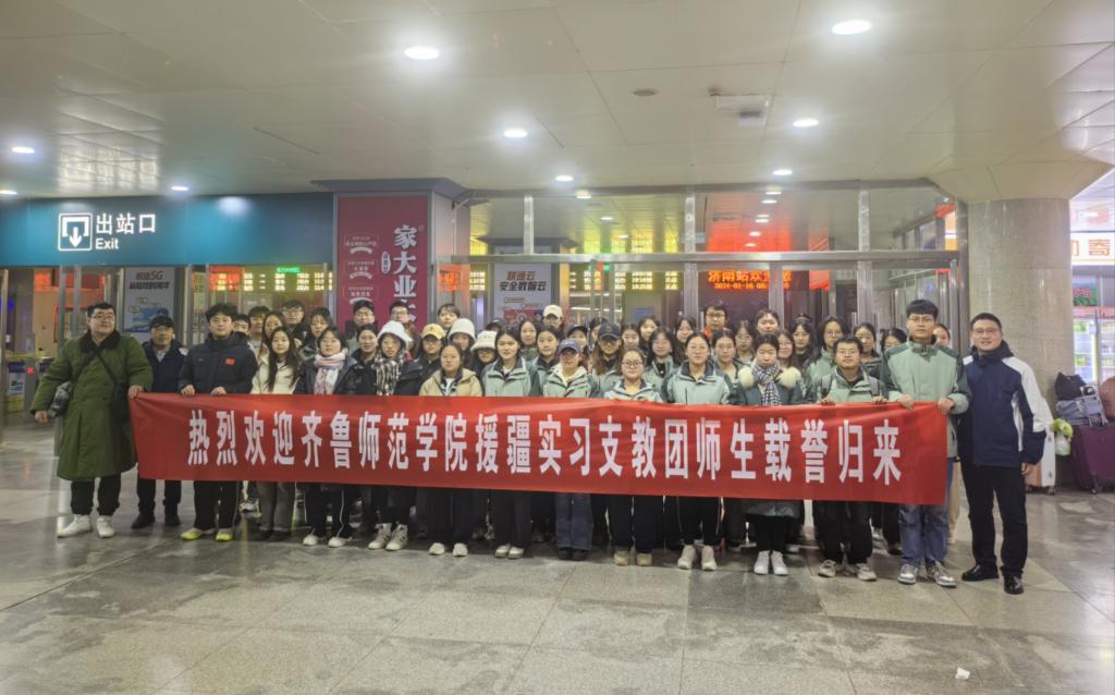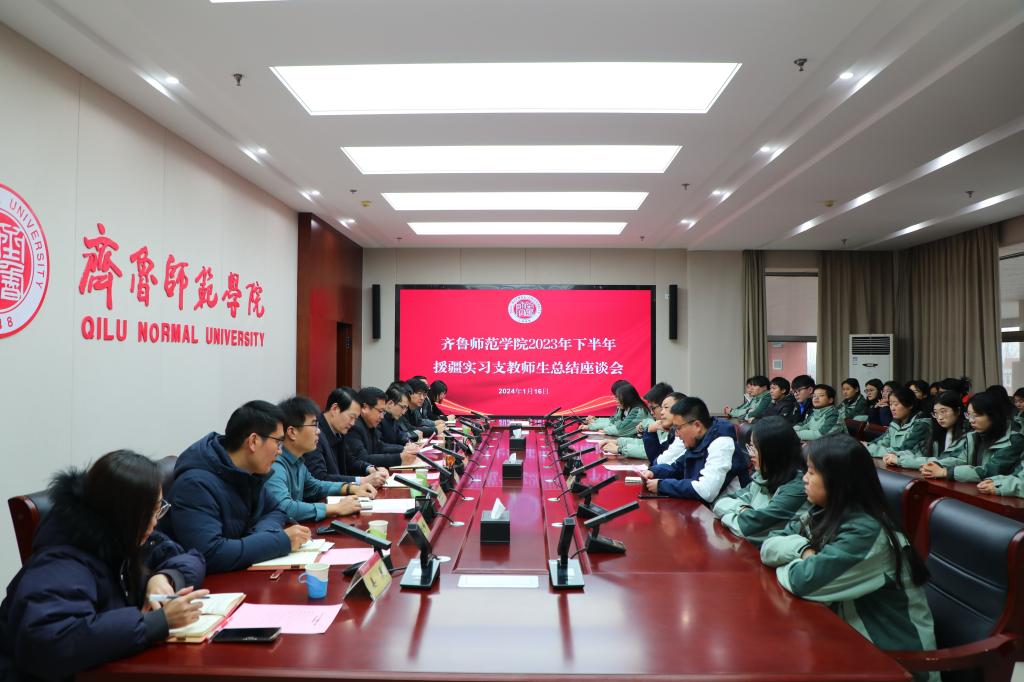 1月16日清晨,BEAT365英国官网第四批暨2023年下半年援疆实习支教师生圆满完成支教任务顺利返济。当日上午,学校在章丘校区第二会议室召开援疆实习支教工作总结会,总结支教先进经验,欢迎师生载誉归来。学校党委副书记、校长郑秀文出席会议并与师生亲切座谈,会议由党委委员、副校长孙正主持。