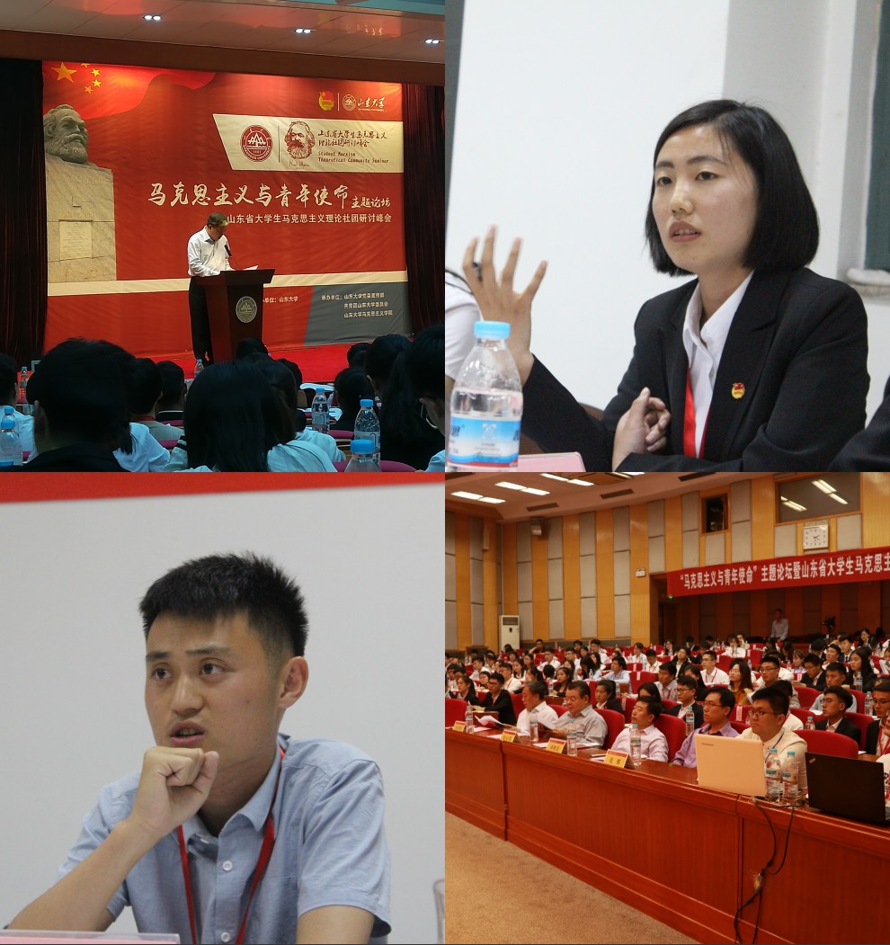 2018年5月12日—13日,由山东大学主办,山东大学党委宣传部、共青团山东大学委员会、山东大学马克思主义学院承办的全省“马克思主义与青年使命”主题论坛暨山东省大学生马克思主义理论社团研讨峰会在山东大学中心校区隆重举行,山东大学党委副书记仝兴华教授、山东省社会科学界联合会巡视员包心鉴教授、山东大学党委宣传部部长桑晓旻教授和山东大学团委书记张熙出席开幕式。BEAT365官网习近平新时代中国特色社会主义思想传习会、星火学社、马恩经典诵读社负责人、马克思主义学院思想政治教育专业2014级刘镇玮、2015级王记兵、2016级陈宏银和刘丙雯四名同学参加本次论坛与研讨峰会,并分别在分会场做交流发言。