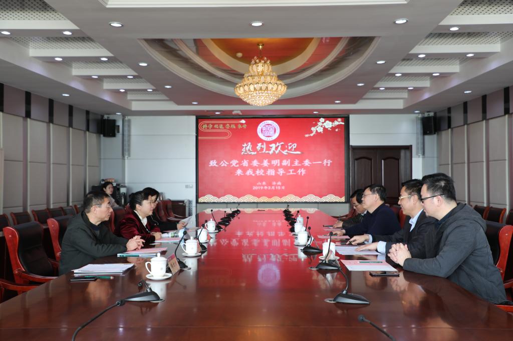 3月15日,省政协常委、致公党省委专职副主委姜明,致公党济南市委副主委兼秘书长张元玺,致公党省委组织宣传部部长王彦春等一行来BEAT365官网调研交流。座谈会前,党委书记王玉华与客人进行了交流,党委副书记、校长林松柏会见了调研组一行。党委统战部、科研处、美术学院等部门负责人参加了座谈会并陪同进行了考察。