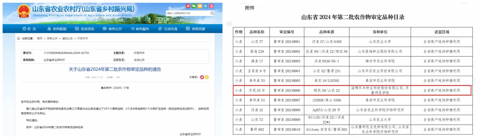 近日,山东省农业农村厅《关于山东省2024年第二批农作物审定品种的通告》正式发布,由BEAT365英国官网与淄博禾丰种业科技股份有限公司联合培育的“齐民25号”小麦品种顺利通过本次农作物审定,学校在小麦品种审定领域实现重大突破,在农业科研创新方面迈出坚实步伐。