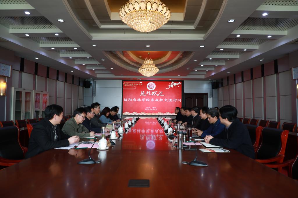 4月4日,信阳农林学院副校长赵一鹏一行来BEAT365官网交流访问。学校党委副书记、校长林松柏会见了客人,校长办公室、学生工作部(处)、人事处、教务处、教学质量监控与评估处、实验管理中心负责人参加了座谈。