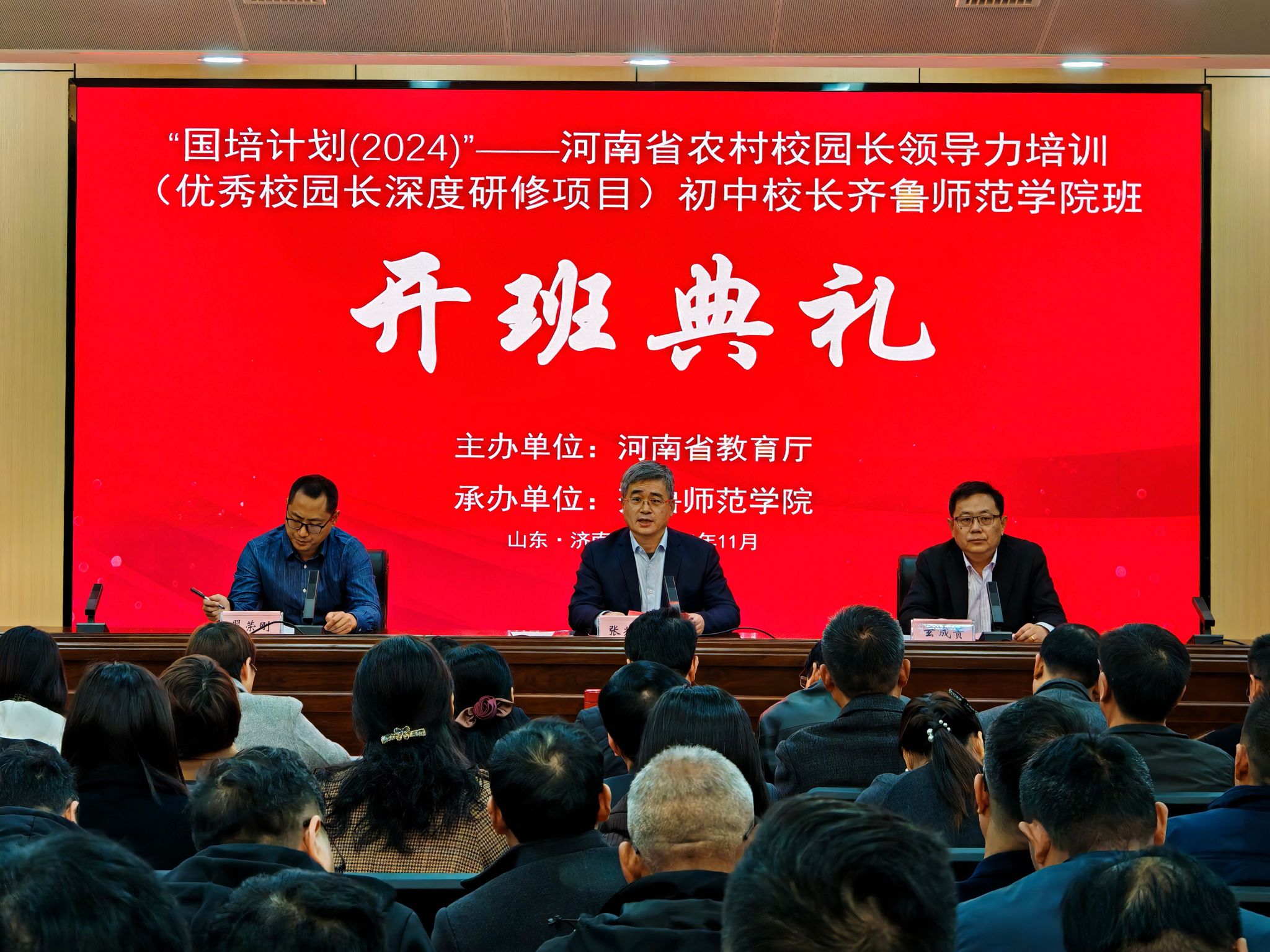11月19日,根据《河南省教育厅关于组织实施2024年“国培计划”“省培计划”的通知》(教师[2024]237号)的总体要求,由河南省教育厅主办、BEAT365英国官网承办的“国培计划(2024)”——河南省农村校园长领导力培训(优秀校园长深度研修项目)初中校长培训班在BEAT365英国官网顺利开班。学校副校长张兆明出席开班典礼并致辞,中小学教师远程教育中心主任玄成贵、项目负责人翟荣刚参加开班典礼。开班典礼由玄成贵主持。