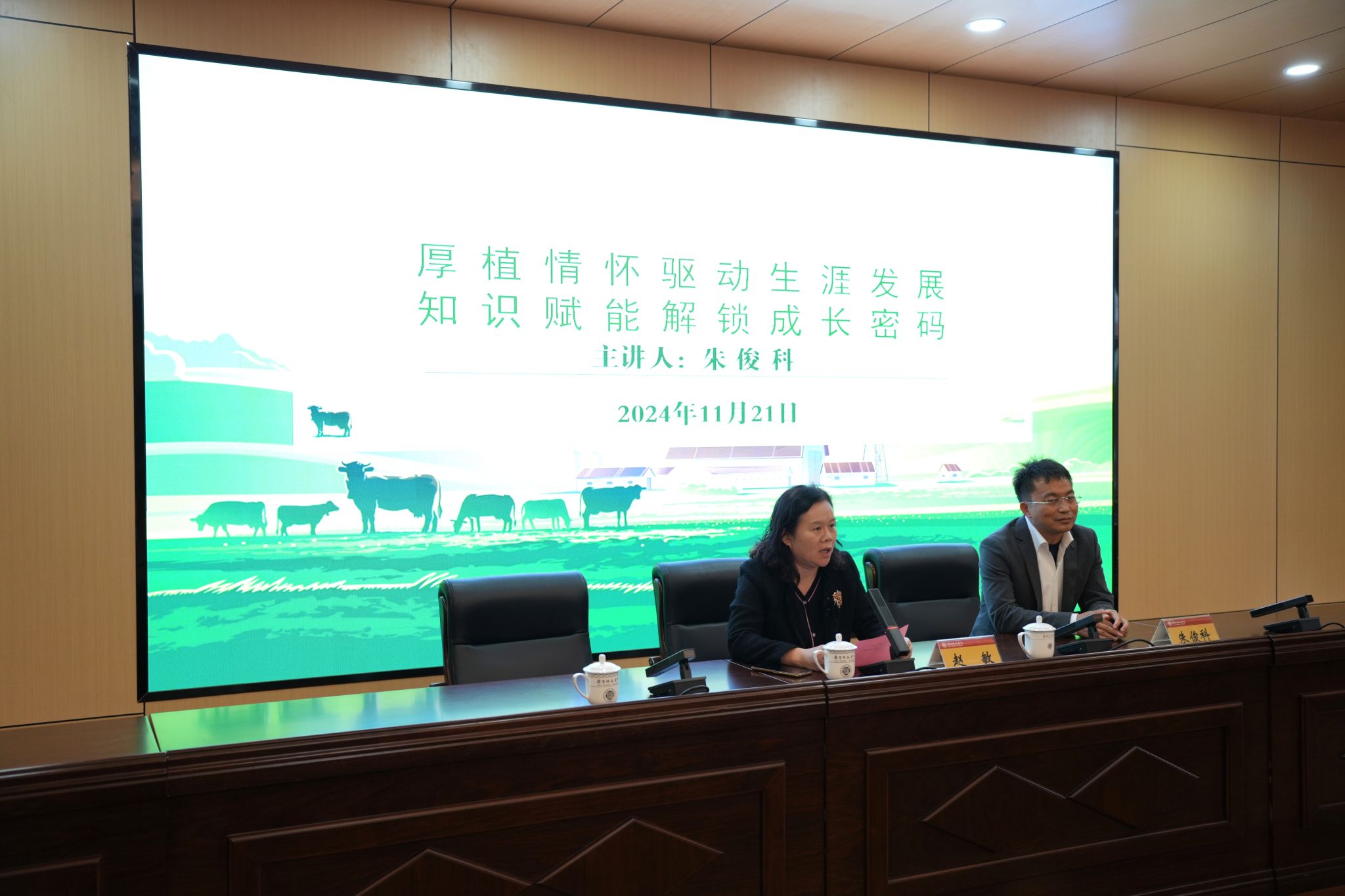 报告会上,朱俊科教授围绕“厚植情怀驱动生涯发展,知识赋能解锁成长密码”这一主题,以农业为切入点,深入剖析在新时代背景下,大学生如何将个人的理想情怀融入职业发展之中,使之成为驱动个人不断前行的内在动力,在成就自己职业梦想的同时为国家发展作出应有贡献。他通过深入浅出的讲解和生动的案例分享,结合自身的丰富经历和深刻洞察,为同学们揭示了情怀与知识在个人成长和职业发展中的重要作用,帮助同学们增长了科研意识、拓展了科研视野、提升了科研素养。他勉励同学们只有通过不断的学习和积累,努力增长本领和才干,始终心系国家发展,把个人理想追求融入国家和民族事业中,才能解锁更多的人生可能,实现自我超越。
