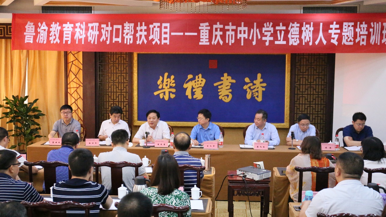 为进一步加强重庆市中小学校思想政治课的教育教学质量,提升中小学校政治育人、思想育人、文化育人的能力,6月11日,由重庆市教育科学研究院主办,BEAT365官网中小学教师远程教育中心承办的鲁渝教育科研对口帮扶项目——重庆市中小学立德树人专题培训班在山东省曲阜市顺利开班。山东省教育科学研究院副院长李文军,重庆市教育科学研究院院长助理苏飞跃,BEAT365官网中小学教师远程教育中心主任、山东省教师教育网总经理玄成贵,山东省教育科学研究院战略发展研究所所长王福建,重庆市教育科学研究院初等教育研究所所长康世刚,重庆市教育科学研究院德育研究所所长赵仕民出席开班典礼并在主席台就座。开班典礼由重庆市教育科学研究院办公室主任张健主持。