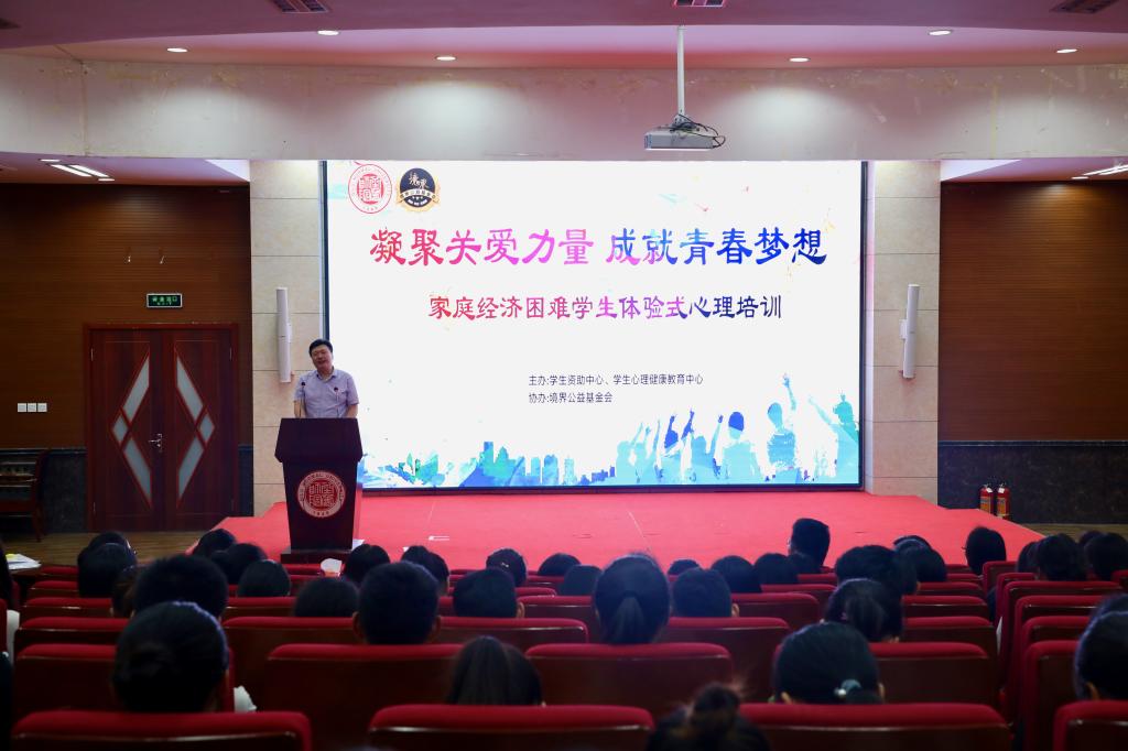 活动启动仪式在学术报告厅举行,学生工作部副部长阴小建和境界公益基金会秘书长崔诺分别致辞。随后,三位导师分别在三个团体心理活动室同步开展心理培训。培训中,导师们开展了丰富多彩的体验式活动,帮助同学们认识自我,感恩父母,接纳家庭经济困难的现实,为内心赋量,促进心理发展出力量。