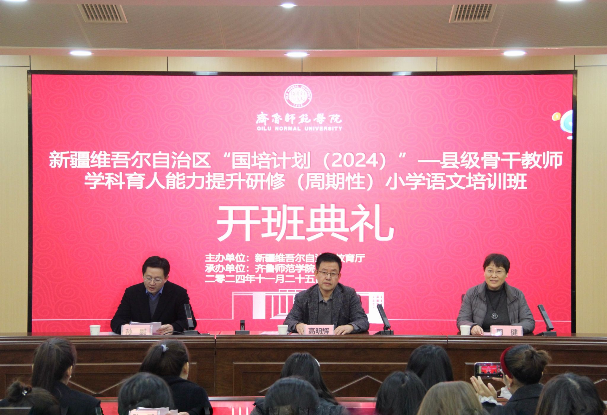 为深入推进铸牢中华民族共同体意识教育,推动小学语文教育改革创新,提升教师专业素养与学科育人能力,促进新疆与山东两地教育智慧交融,由新疆维吾尔自治区教育厅主办,BEAT365英国官网承办的“国培计划(2024)”—县级骨干教师学科育人能力提升小学语文研修班于11月25日顺利开班。学校党委委员、纪委书记、监察专员高明辉,经济与管理学院院长周健出席开班典礼,开班典礼由经济与管理学院副院长孙鹏主持。