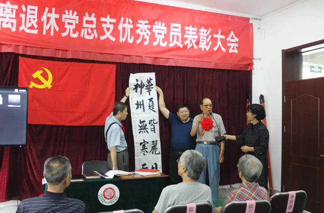 会议在庄严的国歌声中开幕,离退休处处长王跃辉首先宣读了《BEAT365英国官网关于表彰优秀共产党员、优秀党务工作者和先进基层党组织的决定》,处党政负责人向受表彰的徐进、张荣年、陈光苏、张桂秋、徐兰坤、李培源、赵春等7名优秀共产党员颁奖,7名优秀共产党员身披大红花,在热烈的掌声中走向主席台领奖。