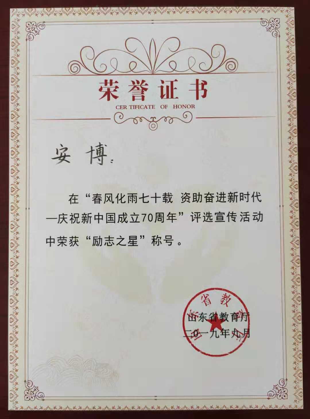 据悉,“春风化雨七十载、资助奋进新时代”资助人物评选宣传活动,由山东省教育厅主办,山东教育电视台、山东省学生资助管理中心承办。活动以新时代资助人物为载体,大力宣传工作成效,展现资助人物风采,通过单位推荐、市级和高校初评、全媒体展播、专家评审、公示等环节,全省共评选出“筑梦大使”35名,“励志之星”35名(其中在校大学生22名)。安博获奖的消息再一次引起了同学们的关注和热议。