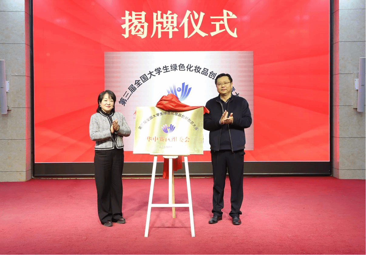 郑秀文、朱怡霖为第三届全国大学生绿色化妆品创新创意大赛华中赛区组委会揭牌,朱怡霖为姬胜利、曹晓荣颁发组委会主任聘书,程伟为唐子安颁发荣誉主任聘书,程伟和曹晓荣为崔基炜等颁发副主任聘书。