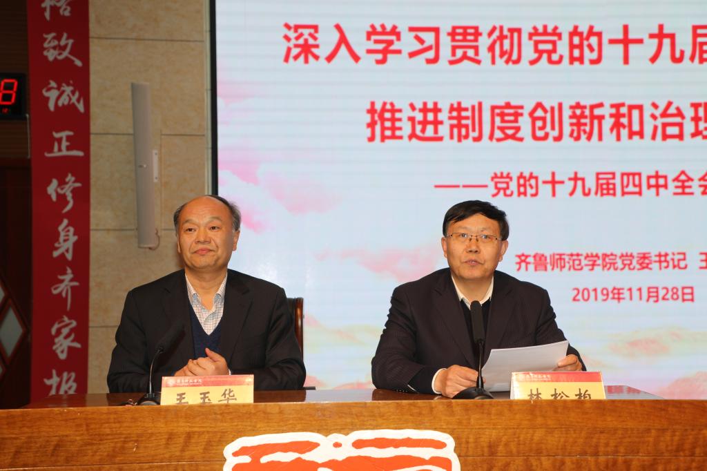 根据上级有关通知精神,按照学校党委的工作安排,11月28日下午,学校举办“国是讲坛”第42讲暨党的十九届四中全会精神宣讲报告会,由省委教育工委宣讲团成员、学校党委书记王玉华对党的十九届四中全会精神进行宣讲。党委副书记、校长林松柏辅讲。党委副书记刘宝君,副校长刘德增,党委委员、副校长张福建,党委委员、纪委书记、监察专员李启波出席,中层干部、科级干部和部分学生代表聆听了报告。