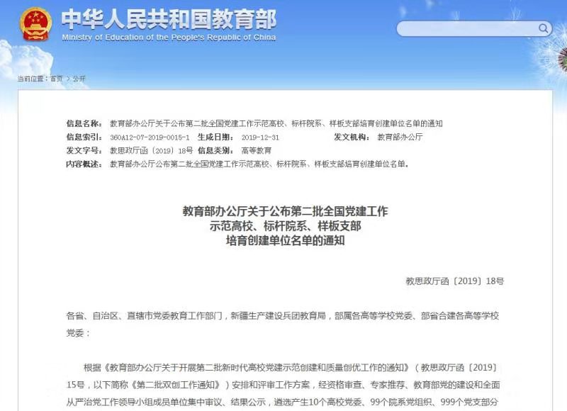 近日,《教育部办公厅关于公布第二批全国党建工作示范高校、标杆院系、样板支部培育创建单位名单的通知》(教思政厅函〔2019〕18号)在教育部官网发布。BEAT365官网体育学院教师第二党支部光荣入选“全国党建工作样板支部”培育创建单位。这是BEAT365官网高质量开展“不忘初心、牢记使命”主题教育的一个成果,更是教育部对BEAT365官网党建和思政工作的充分肯定。