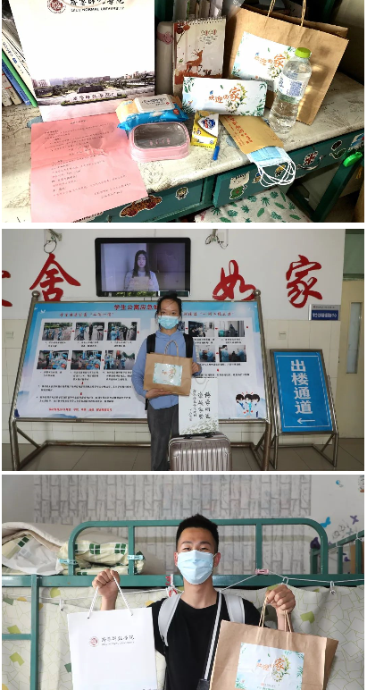 返校学生按指定路线返回宿舍楼,并在楼前进行二次测试和身份核验,领取学校为大家准备的暖心大礼包,里面包含:一份关于“回家”注意事项的温馨提示、台历、口罩、消毒纸巾、免洗消毒液、喷雾酒精等防疫物品,贴心实用,让每一位返校学子都能够感受到学校的温暖。