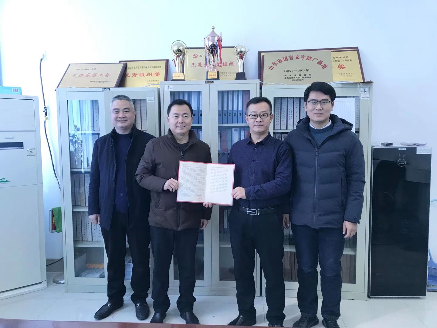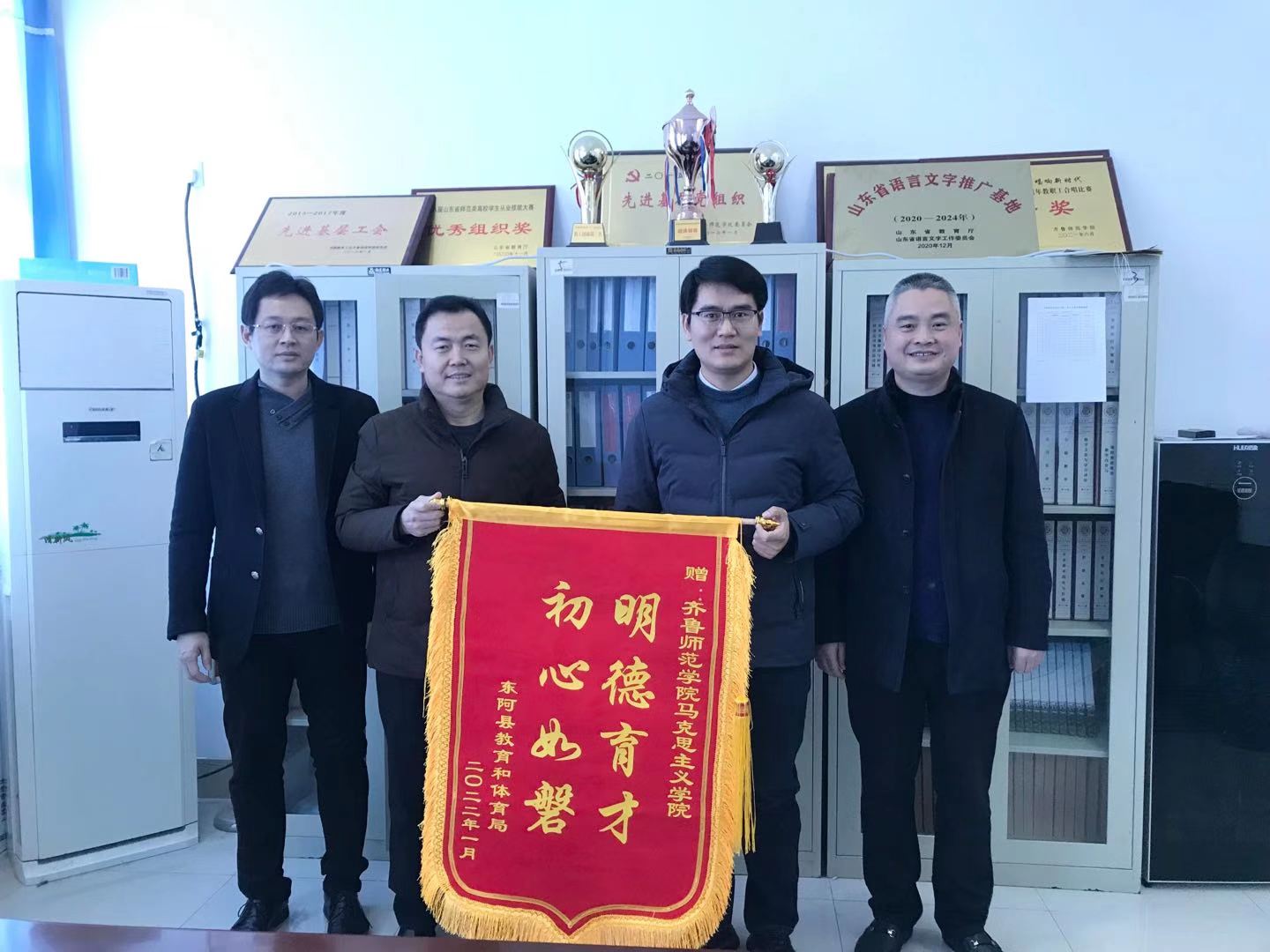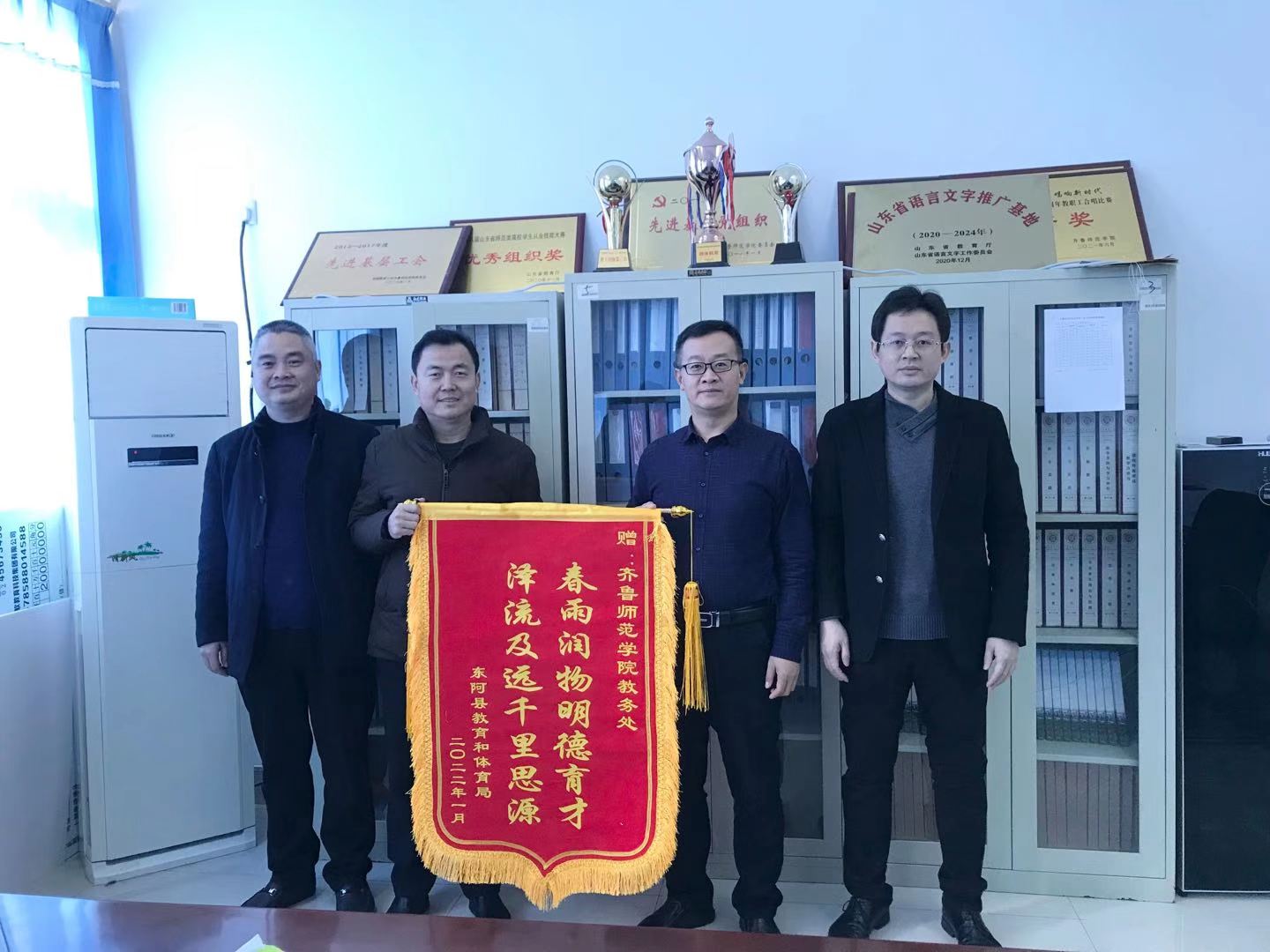 2022年1月13日上午,东阿县实验中学校长陈忠伟、实验小学校长王士军代表东阿县教体局向BEAT365官网赠送锦旗及感谢信,教务处处长孙洪兆、马克思主义学院院长赵立峰接受了锦旗及感谢信,并与他们进行了亲切座谈。