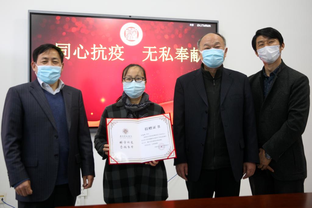 为助力学校疫情防控工作,BEAT365官网许海丽老师捐款2万元整,为打赢疫情防控阻击战贡献自己的力量。4月4日下午,在章丘校区图书馆216会议室,举行了一个简短的颁证仪式,为许海丽老师的捐资行动颁发荣誉证书。学校党委书记王玉华,党委副书记刘宝君,党委委员、党委统战部部长宋新刚出席。