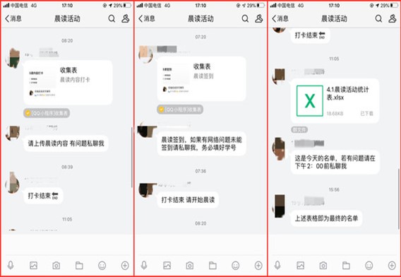 利用第一节课前十分钟晨读经典,此举在音乐学院已经推广了一年多。音乐学院的张博涵同学作为一名班长,每天都在群里督促大家晨读和早锻炼。冯康同学近几日晨读的是朱自清的散文,早锻炼项目是俯卧撑和瑜伽。“学校的健康指导很及时,晨读和早锻炼令我们神清气爽地开始一天的生活”, 冯康的回答充满活力。