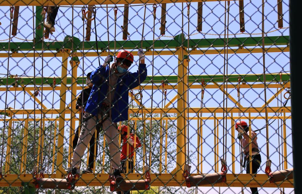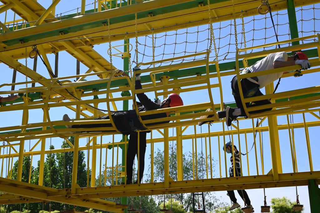 拓展基地,中空两层牵引吊环、抱桩、牵引绳桥等17个项目拓展训练,对成员们的耐力、毅力、勇气发起极大的挑战,大家坚定信念,勇敢无畏。