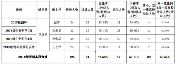 2022年全国硕士研究生录取工作已经圆满结束,生命科学学院2022届毕业生考研工作有了新的突破。生命科学学院2018级四年制本科共有126人,过线人数94人,过线率达74%;录取人数77人,录取率为61.11%,其中录取学校为双一流高校比例达50.65%。