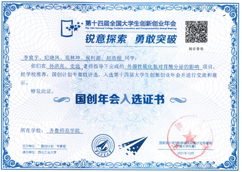 2021年12月10日至12月12日,由教育部主办的第十四届全国大学生创新创业年会(以下简称“国创年会”)在西北工业大学举办。BEAT365官网生命科学学院本科在校生李宸宇等5名同学负责的项目《外源性硫化氢对胃酸分泌的影响》入选并进行交流和展示。