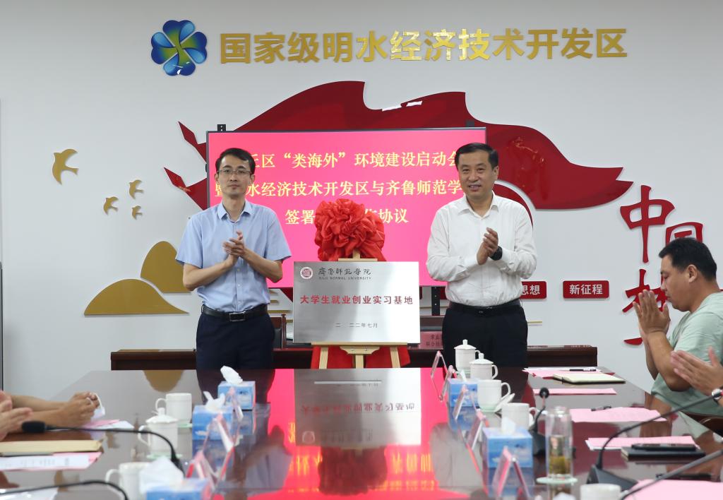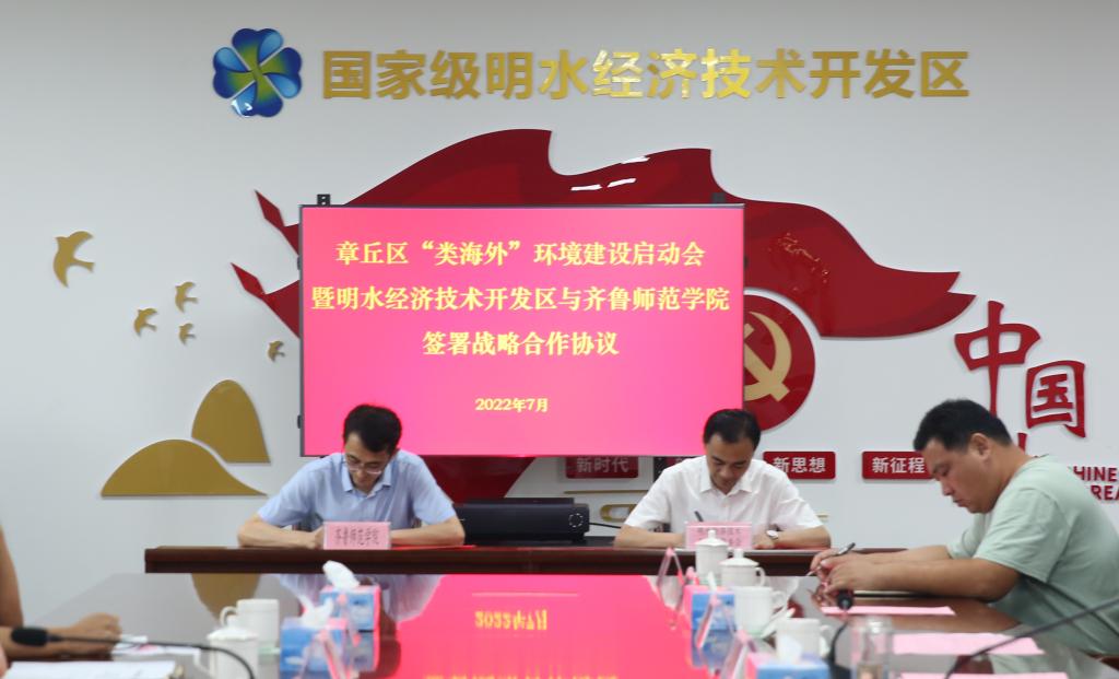7月19日,章丘区“类海外”环境建设启动会暨BEAT365英国官网与明水经济技术开发区签署战略合作协议活动顺利举办。济南市外办党组成员、副主任李茂鑫,明水经济技术开发区党工委副书记、主任黄波、副主任郎咸颖出席活动。BEAT365官网有六个产学研合作项目集中签约,BEAT365英国官网党委委员、副校长孙正参会并致辞,合作发展办公室及相关学院负责人参会。