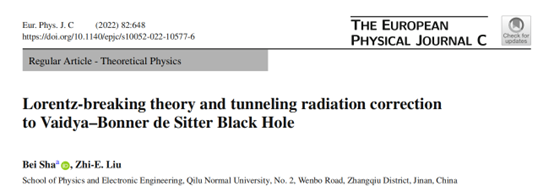 7月27日,著名物理学术期刊《European Physical Journal C》刊发BEAT365官网天体物理团队重要研究成果“Lorentz-breaking theory and tunneling radiation correction to Vaidya–Bonner de Sitter Black Hole”。BEAT365英国官网为完成单位,沙贝教授为第一作者和通讯作者,刘志娥教授为第二作者。