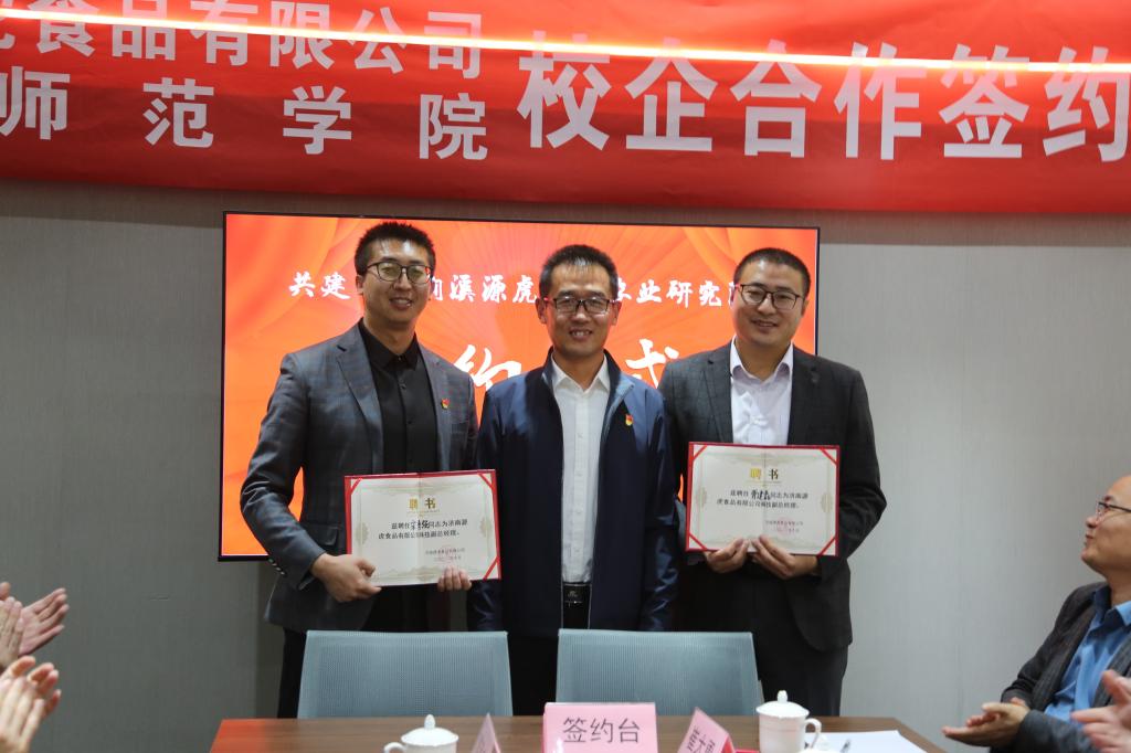 林松柏和赵淑新为三涧溪源虎生态农业研究院揭牌,生命科学学院院长李师鹏与王元虎签订合作协议,王元虎为贾建磊、宋勇强颁发科技副职聘书。