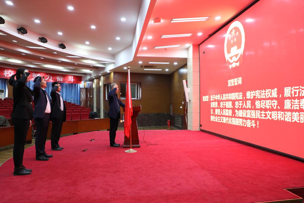 纪委副书记于绍军同志主持宣誓仪式并领誓。宣誓仪式开始后,全体人员面向国旗、国徽高唱国歌。随后,领誓人站在领誓台上,左手抚按宪法,右手握拳举起,领诵誓词。其他监察官面对国旗和国徽、紧握右拳、整装肃立,跟诵誓词,共同作出庄严承诺:“我宣誓:忠于中华人民共和国宪法,维护宪法权威,履行法定职责……”铮铮誓言、字字千钧,向宪法庄严宣誓,意味着责任和使命,表达出弘扬法治精神、履行宪法使命的坚定决心。