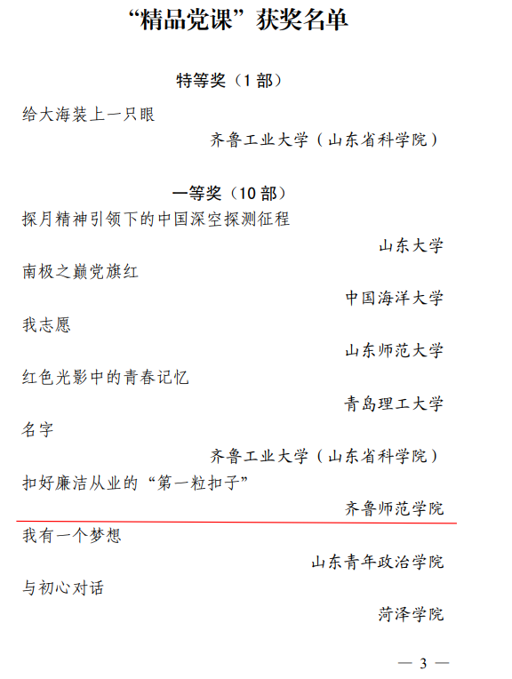 据悉,为深入学习贯彻党的二十大精神,全面学习贯彻习近平新时代中国特色社会主义思想,不断增强党组织的政治功能和组织功能,切实发挥优秀典型引领示范作用,推动形成比学赶超、互学互促的良好氛围,自2022年3月,山东省委教育工委面向全省高校开展了“精品党课”以及灯塔“我和我的支部”作品征集活动。经专家集中评审,研究确定全省高校“精品党课”61部,其中,一等奖10部。