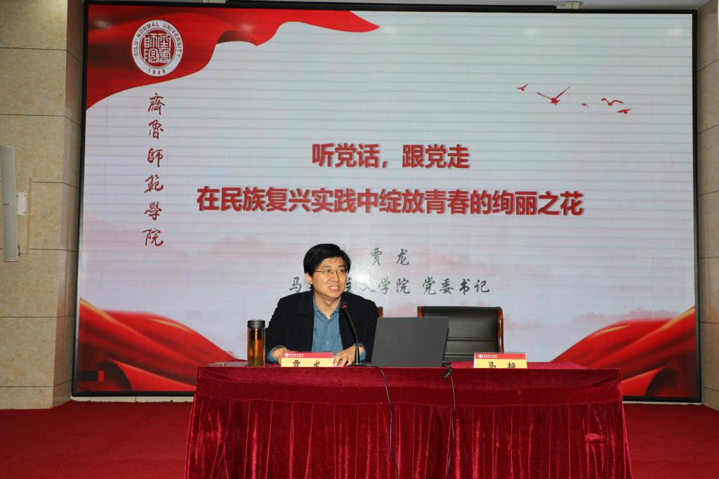 开班式结束后,马克思主义学院党委书记贾龙作了题为《听党话,跟党走,在民族复兴实践中绽放青春的绚丽之花》的专题辅导报告。他从立鸿鹄志、笃定信仰、筑青春梦三个方面展开,对发展对象为什么要立志高远、坚定马克思主义的科学信仰、共产主义的远大理想、中国特色社会主义共同理想做了讲解。作为党员发展对象,更应当在新征程中勇担责任使命,忠于祖国,忠于人民,处理好个人理想与社会理想的关系;知行合一,躬行实践,处理好仰望星空与脚踏实地的关系;信念坚定,敢于担当,处理好品德修养与才干本领的关系。