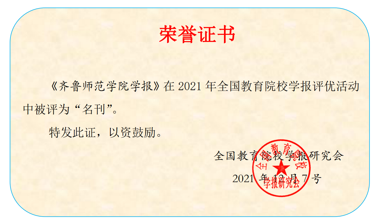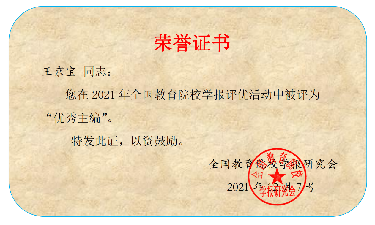 近日,在2021年全国教育院校学报评优活动中,《BEAT365英国官网学报》被评为全国教育院校“名刊”,学报编辑部主任王京宝被评为全国教育院校学报“优秀主编”。