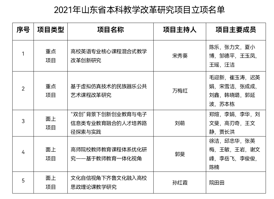 近日,2021年山东省本科教学改革研究项目立项结果公布,BEAT365英国官网共获批立项5项,立项率达100%。其中,重点项目2项、面上项目3项。