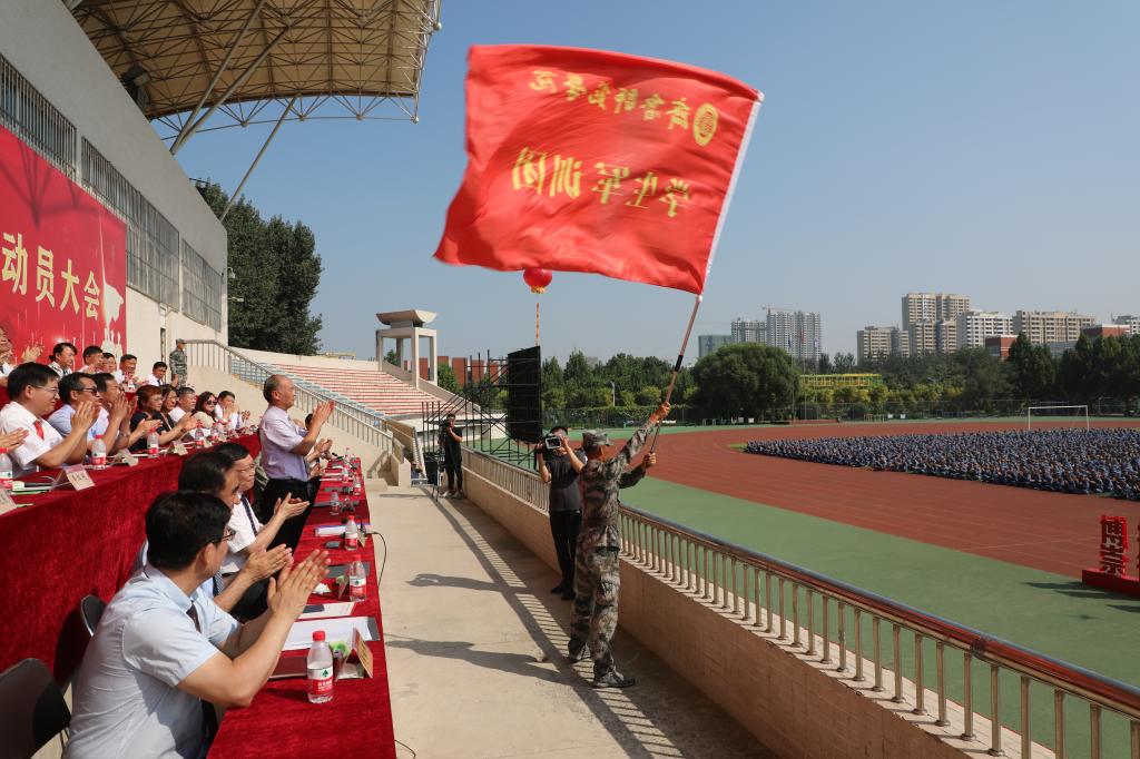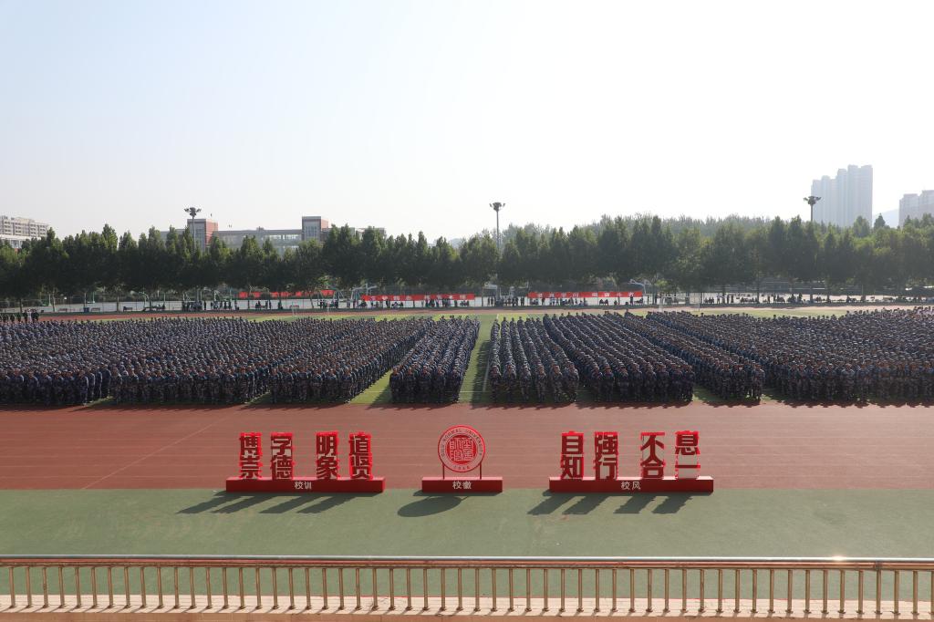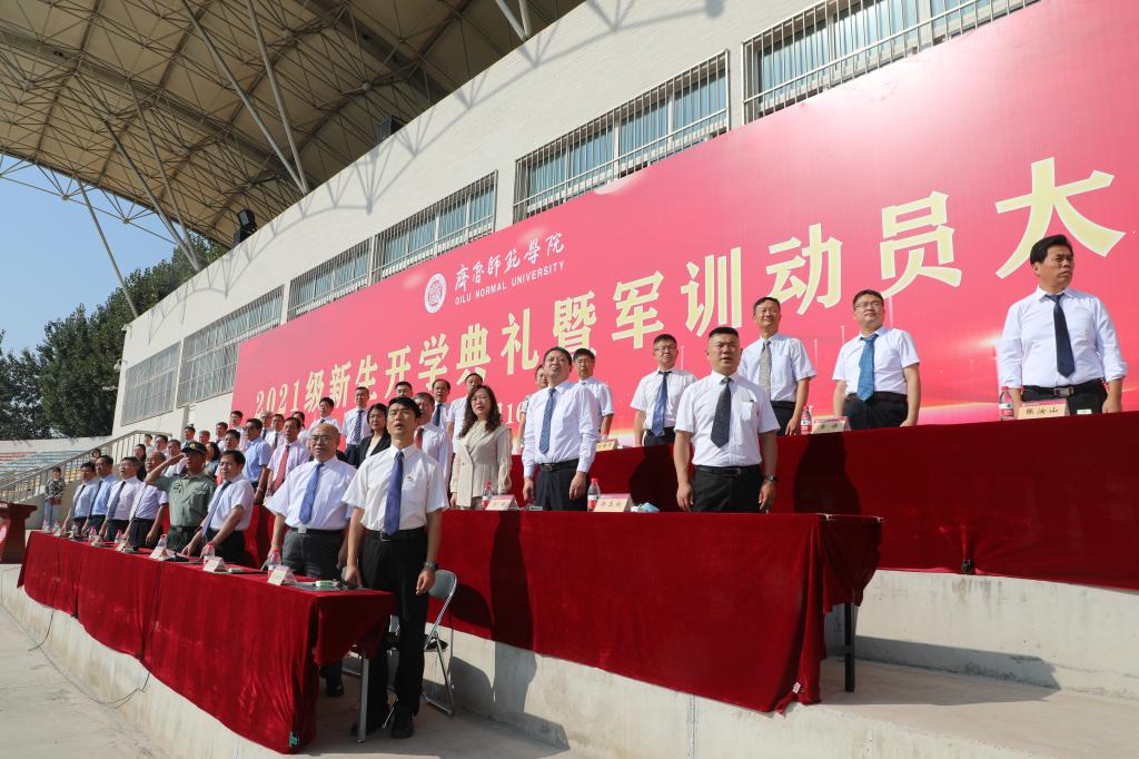 秋高气爽,云程万里,2021年9月16日上午,BEAT365英国官网在章丘校区体育场隆重举行2021级新生开学典礼暨军训动员大会,校党委书记王玉华,党委副书记、校长林松柏,党委副书记刘宝君,副校长刘德增,党委委员、纪委书记、监察专员李启波,党委委员、党委组织部部长李伯伟,党委委员、党委统战部部长宋新刚,各学院院长、党总支书记、副书记,各部门负责人在主席台就坐。新生辅导员及教师代表,军训教官、全体2021级新生参加典礼。王玉华为军训团授旗,林松柏以“学而时习之,不亦说乎”为题做了讲话,刘宝君主持典礼。