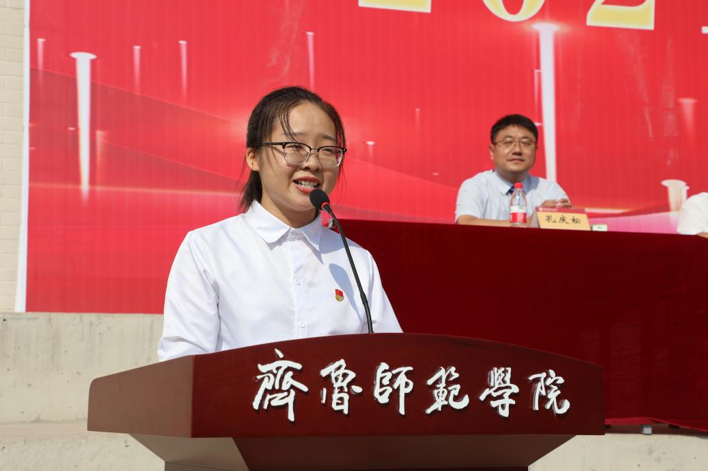 音乐学院2021级王曦同学代表全体新生进行发言。他分享了自己初入大学校园时的所见所闻和心路历程,表示在接下来的大学生活中将志存高远、勤学好问、严以律己,自觉做一个品德高尚的人,不负青春、不负韶华、不负时代,成为德智体美劳全面发展的社会主义合格建设者和接班人。在他的倡议下,全体新生齐声发出“请党放心,强国有我;请师院放心,奋斗有我!”的铮铮誓言。