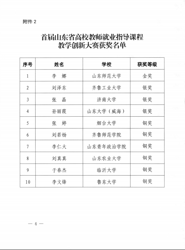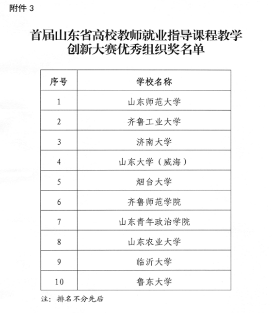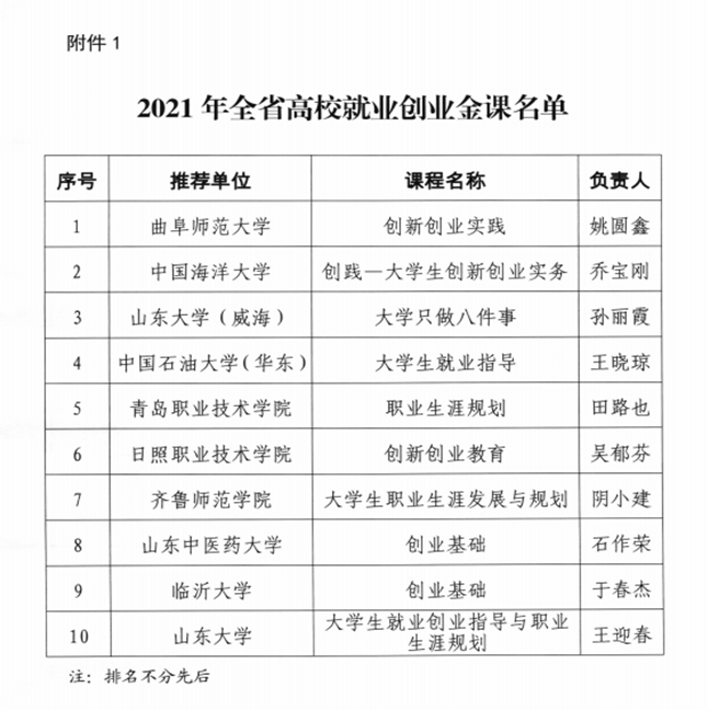 本次全省高校就业创业金课评选和首届高校教师就业指导课程教学创新大赛活动旨在加强全省高校就业创业指导教师队伍建设,提升大学生就业创业指导服务水平。经全省普通高校和技工院校推选,山东省公共就业和人才服务中心组织专家评审遴选,最终确定10门课程为2021年全省高校就业创业金课,10所学校获得首届全省高校教师就业指导课程教学创新大赛优秀组织奖。
