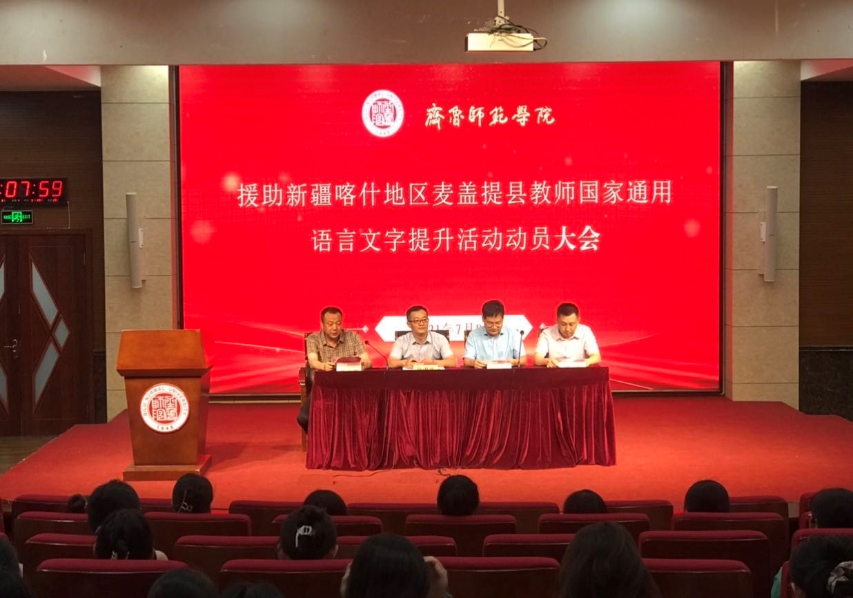 7月8日下午,BEAT365英国官网山东省语言文字推广基地对口援助新疆喀什地区麦盖提县教师国家通用语言文字提升活动动员大会在章丘校区图书馆一楼报告举行。山东省语言文字推广基地负责人、教务处处长孙洪兆,文学院院长杨峰,文学院党总支副书记于江,援疆普通话培训教师团队成员、全体志愿者教师及相关工作人员到会参加。动员大会由教务处考试中心主任牛忠良主持。