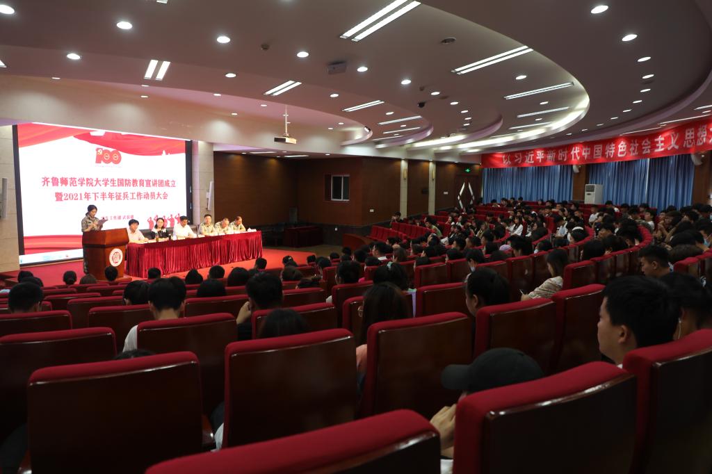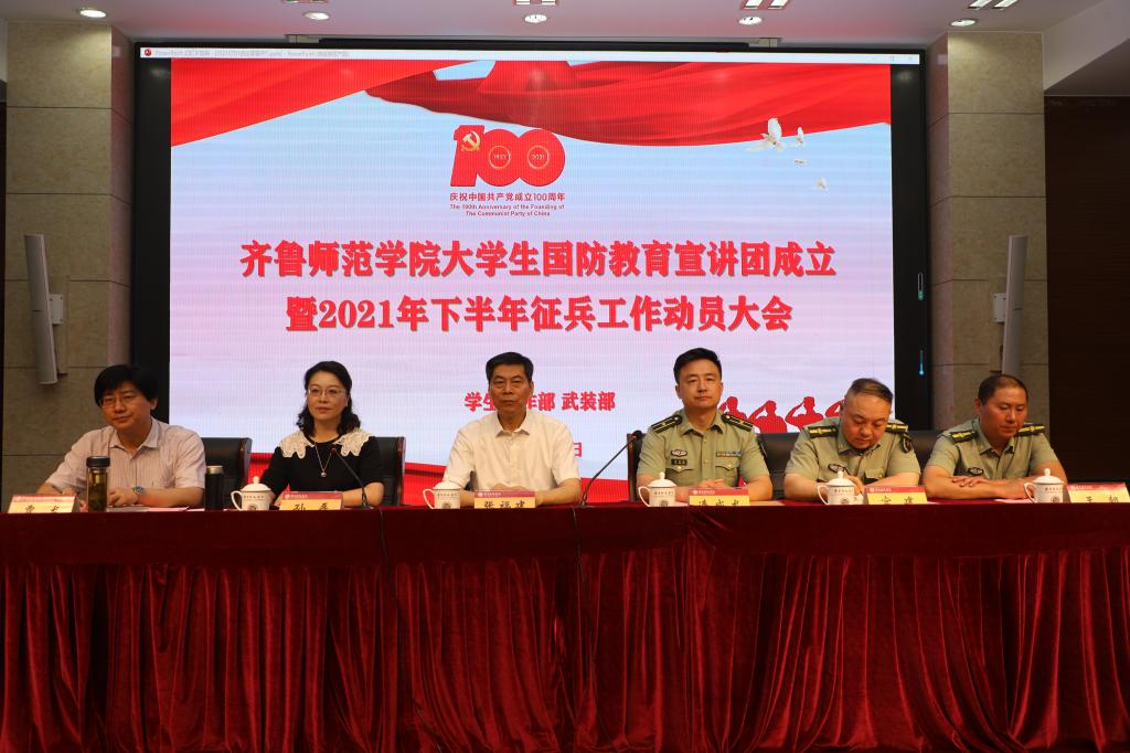 在热烈庆祝中国共产党成立百年之际,为深入贯彻落实习近平强军思想的使命担当,进一步激发BEAT365官网青年学子传承红色基因、增强国防意识、携笔从戎报国的情怀。7月2日上午,BEAT365官网在章丘校区图书馆学术报告厅举办大学生国防教育宣讲团成立暨2021年下半年征兵工作动员大会,党委委员、副校长张福建出席并讲话。本次会议邀请了济南市征兵办公室和历下区征兵办公室到校进行政策宣讲。学生工作部(处)、武装部、各学院党总支副书记,团总支书记、辅导员、全体军事理论课教师、应征入伍报名的学生代表近300人到场聆听,会议由学生工作部(处)、武装部部长孙磊主持。