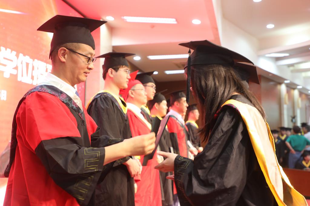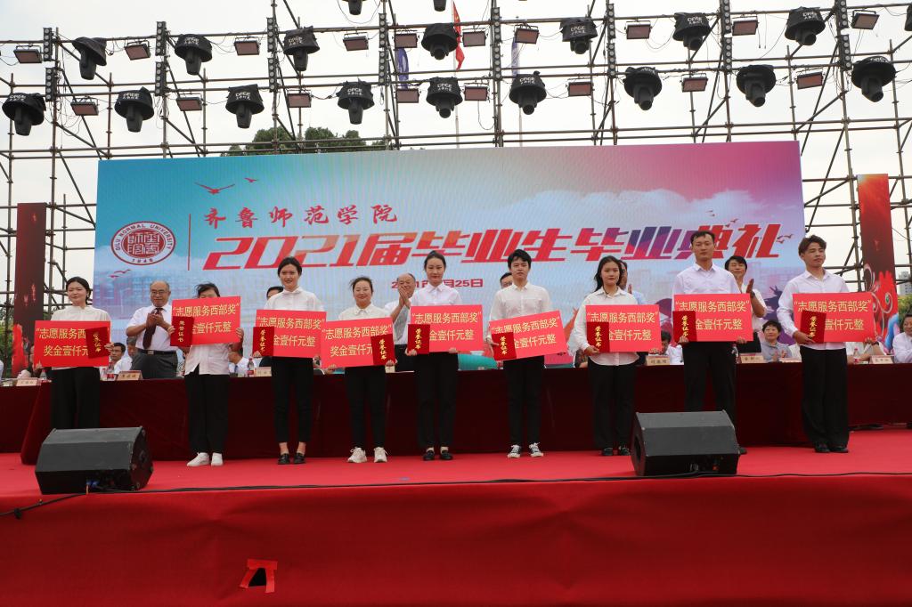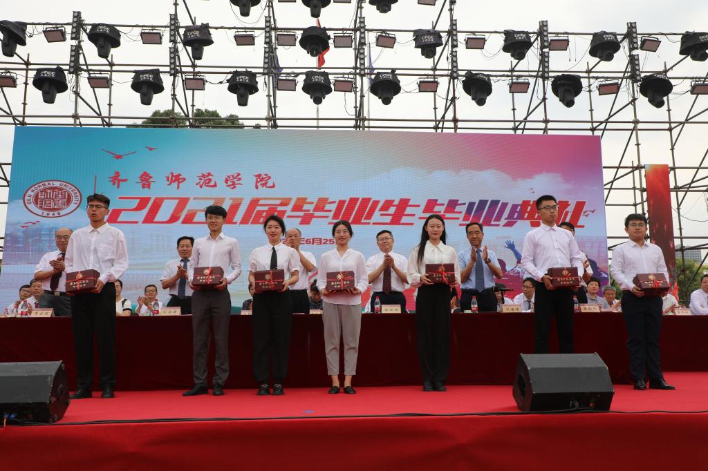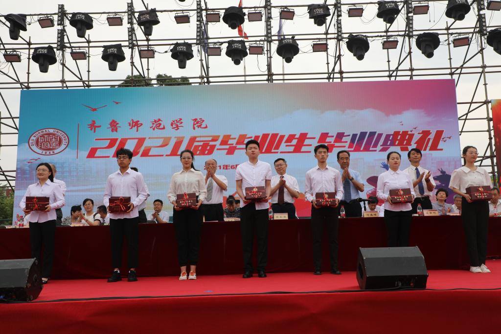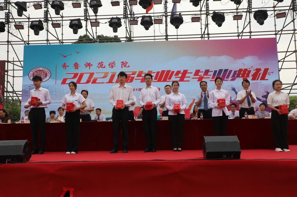 首先,教务处处长孙洪兆宣读2021届毕业生毕业资格及学士学位授予情况报告;学生工作部部长孙磊宣读关于表彰2021届优秀毕业生的决定;团委书记孔庆松宣读关于表彰2021年大学生志愿服务西部计划优秀青年志愿者的决定。然后,学校领导依次为各学院毕业生颁发了毕业证书、优秀毕业生荣誉证书,以及大学生志愿服务西部计划优秀志愿者荣誉证书和奖金。接着,毕业生代表汉语言文学专业刘磊同学和教师代表物理与电子工程学院刘萌博士先后进行了发言。