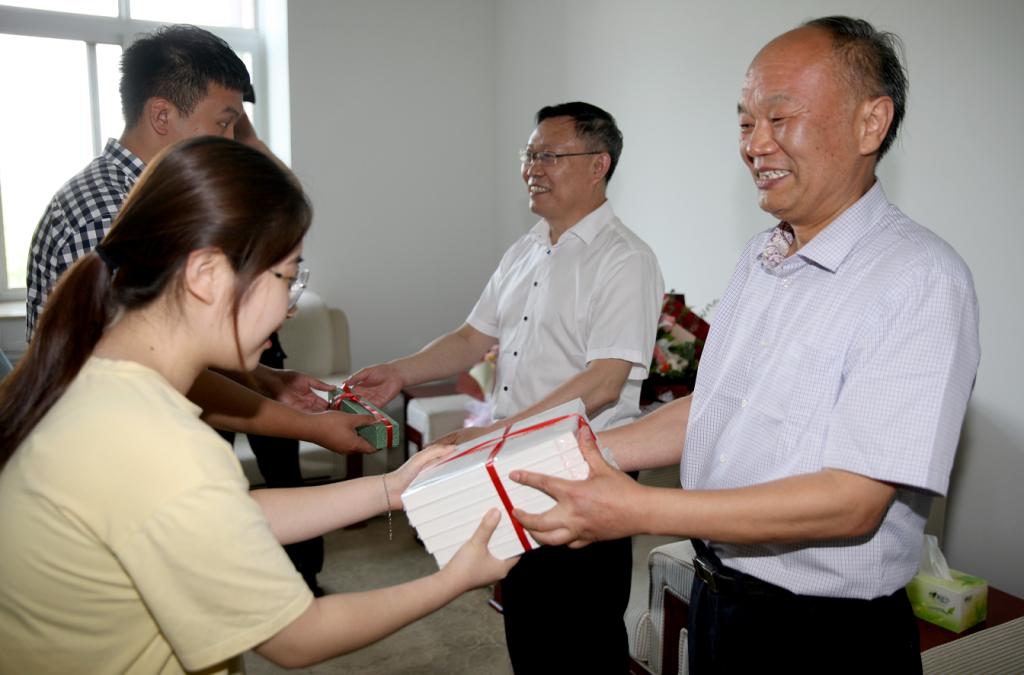 座谈会上,王玉华书记和林松柏校长代表学校和全体教职工,向6位毕业生赠送了山东人民出版社刚刚出版的《跟着共产党走--一本给青年人看的简明党史》一书和嵌有校徽的精致钢制书签,并寄语勉励他们:你们是中国共产党前一个100年历史的见证者,同时更是后一个100年历史的书写者,要认真学好党史,从百年党史中汲取智慧和力量;牢记幸福是奋斗出来的,奋斗的人最幸福;铭记人与人的距离是从学习拉开的,自信会使自己更优秀。希望你们秉承“博学明道 崇德象贤”的校训,在接续奋斗中不断创造新的辉煌。
