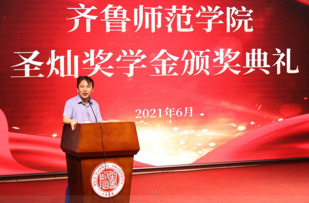 典礼在2020届获奖学生代表的视频获奖感言中拉开序幕。受疫情影响,2020年未能组织“圣灿奖学金”的评选和颁奖活动,今年的评选和颁奖典礼合并为2020和2021两个年度。致辞中,杨峰向与会人员介绍了近两年奖学金评选情况,经初评、复评等环节,共确定了2020年度倪翠婧等54名同学,2021年度刘磊等58名同学获得当年度“圣灿奖学金”。自2019年第二批奖学金评选开始,作为引导和鼓励,文学院在“圣灿奖学金”评选中,有重点的向考研成绩优异,向获得省级从业技能大赛突出成绩以及通过组织部选调的学生倾斜。