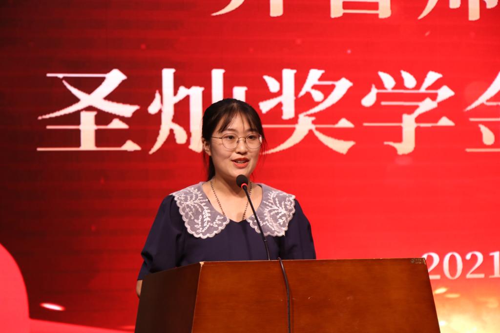 2021年度“圣灿奖学金”获奖代表2017级汉语言文学二班学生刘磊分享了获奖感言。她表示会将感恩、感激、感谢之情化为奋斗前进的不竭动力,在未来的日子里继续奋斗,持续努力,力争取得更加优异的成绩。