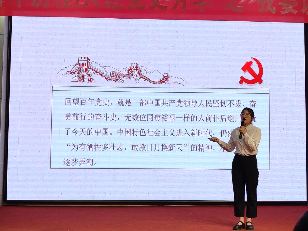 近千名选手在经历初赛、复赛后有11名同学脱颖而出进入决赛。学术报告厅内,党旗鲜艳,红旗漫卷,一曲《映山红》拉开整场比赛的帷幕,整个比赛分为开天辟地见曙光、艰苦创业谋发展、砥砺前行筑华章三个篇章,每个篇章以一个特别节目开场,节目选取各个历史时期最具有代表性而又广为流传的节目,结合情景讲述、歌舞表演、诗歌朗诵等艺术形式,全景式地展示了中国共产党从 “一大”开始的百年光辉历程,热情讴歌一代又一代的共产党人领导中国人民实现民族独立、国家富强、人民富裕、社会和谐发展所取得的辉煌成就。