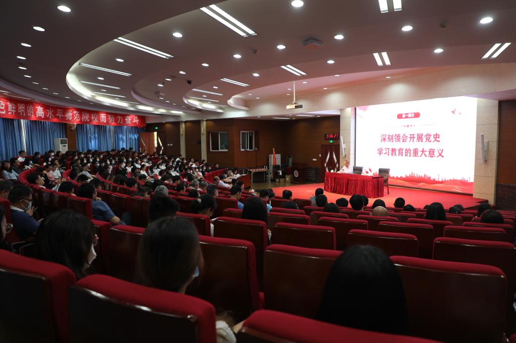 王玉华结合个人学习党史的体会、学校事业发展实际,从“深刻领会开展党史学习教育的重大意义”“全面了解中国共产党百年奋斗的光辉历程”“学习百年党史的体会与感悟”以及“体悟党的初心使命,开创学校事业新局面”等四个主要内容进行了深入剖析和延展解读。在两个小时的党课报告中,王玉华紧密结合学习领会习近平总书记关于党的历史的重要论述,从九个方面宣讲了开展党史学习教育的重大意义;从纵向把握历史阶段、逻辑把握理论成果两个维度回顾了党的百年光辉历程,帮助师生准确把握中国共产党百年历史的主题主线、主流本质;从不忘初心使命,革命精神代承;牢记理想信念,永远砥砺前行;秉持人民至上,增进民生福祉;理论联系实际,回应时代呼唤;勠力攻坚克难,汇聚民族力量五个方面谈了个人学习百年党史的体会与感悟;在强化理论武装,突出学以致用;坚守立德树人,培育时代新人;增强宗旨意识,全力服务师生;改革创新作为,促高质量发展四个方面提出了具体要求。专题党课层层推进、脉络明晰,既高瞻远瞩、立意深远,又平实亲切,感染力强。