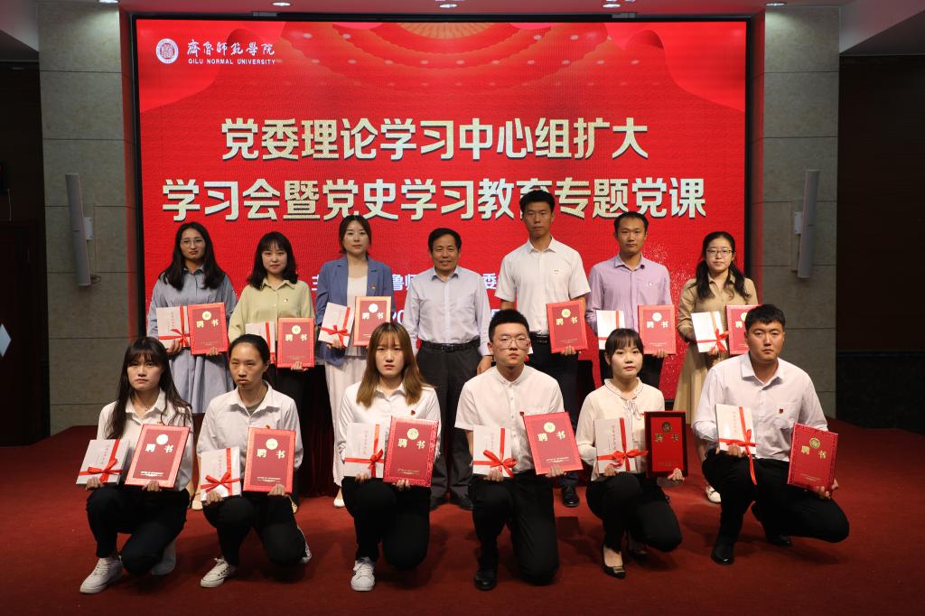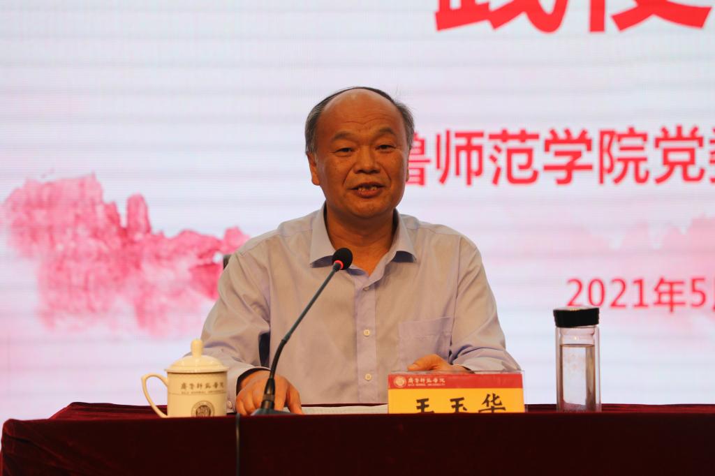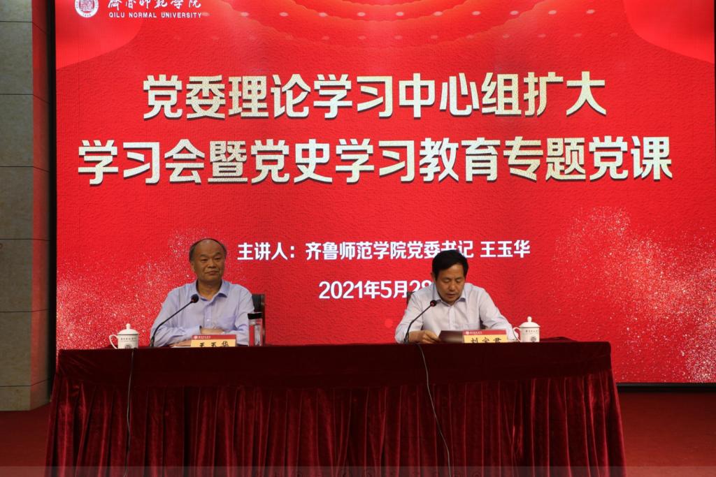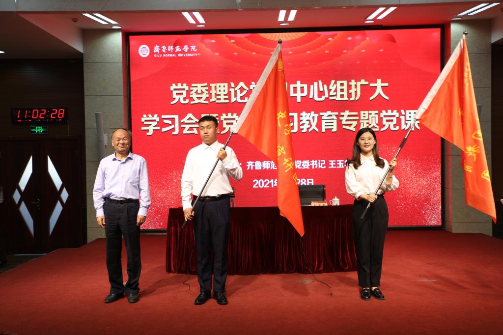 5月28日上午,BEAT365英国官网在章丘校区图书馆学术报告厅举行党委理论学习中心组扩大学习会暨党史学习教育专题党课,党委书记王玉华以《学党史坚守初心 践使命砥砺前行》为题给师生讲授党课,并为辅导员及学生党史学习教育宣讲团授旗。省委党史学习教育第十八巡回指导组刘亚斌、闫旭两位同志到会指导,学校领导、全体中层干部、全体辅导员以及部分学生代表参加。党委副书记刘宝君主持党课。