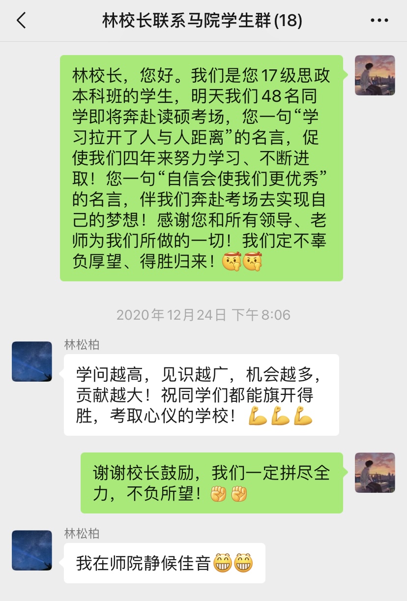 一是学校党委高度重视,营造良好校风、教风、考风。学校坚持“一切为了学生的发展”理念,秉承“博学明道,崇德象贤”的校训,坚持文化育人,形成爱学乐学、爱教乐教的氛围,校领导直接联系马克思主义学院,落实校领导联系班级和学生制度,定期召开学生座谈会,建立师生微信群等。在备考期间,林松柏校长寄语学院学生:“不为纷扰所惑,不为名利所困;珍惜当下时光,专注未来目标”,考前更是给学生方法指导和加油鼓劲。