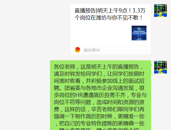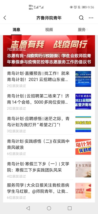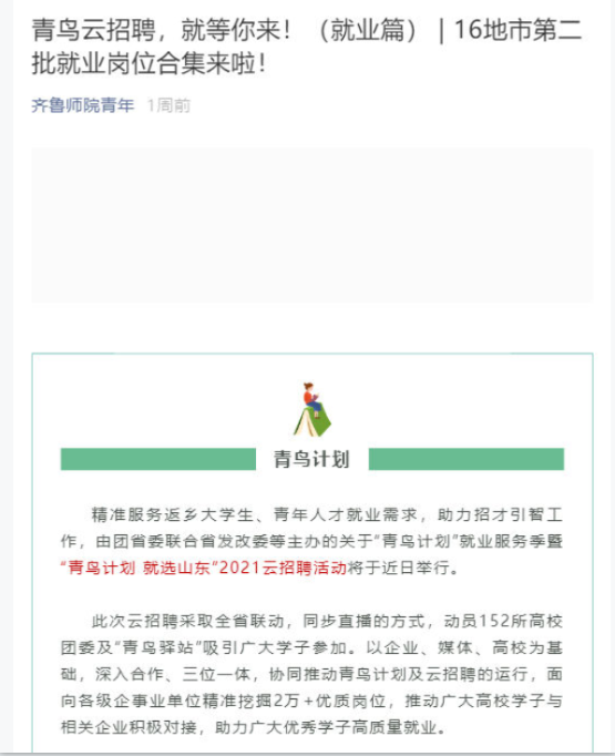 一、宣传动员到位,有序协调统筹推进。根据团省委统一部署,BEAT365官网团委创新工作模式,成立青鸟计划交流专群,进行线上青鸟计划云招聘经验交流及工作部署,专门的老师负责青鸟计划工作,压实责任到人;云招聘期间,通过“齐鲁师院青年”官方微信平台发布青鸟计划相关微信35篇,面向所有师院青年广泛宣传青鸟计划,动员学生参与青鸟计划云招聘活动;为确保各二级学院有效动员落实,校团委还与各学院团总支书记进行一对一沟通对接,强调服务学生就业的重要性、必要性,强化二级学院团委责任意识。