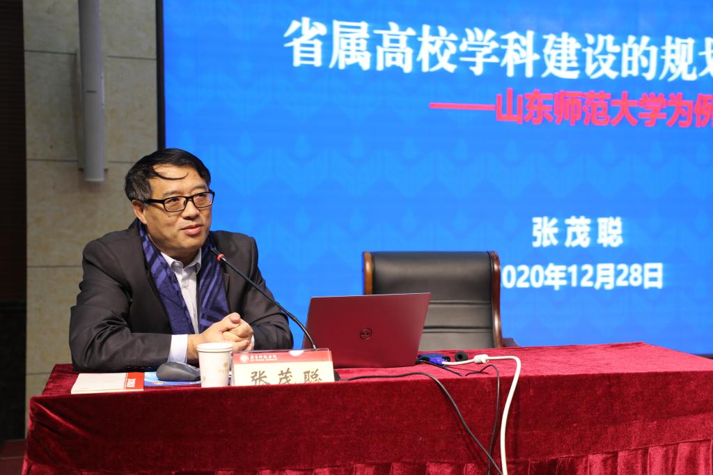 随后,山东师范大学发展规划与学科建设处处长张茂聪作了专题报告。报告从学科概念、学科和专业的区别、提升学科竞争力的核心要素、关键问题、学科建设的基本逻辑、“十四五”发展规划新思考等六个方面,结合山东师范大学学科建设经验,作了详细的阐述。