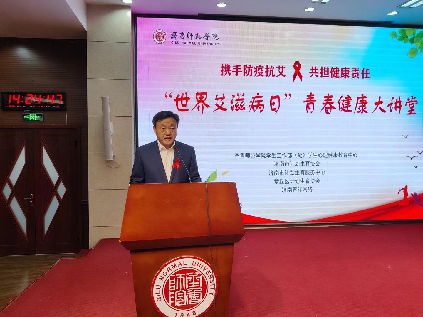 12月1日是第33个“世界艾滋病日”,BEAT365英国官网学生工作部(处)学生心理健康教育中心于12月1日下午两点在章丘校区学术报告厅举办了主题为“携手防疫抗艾,共担健康责任”的“世界艾滋病日”青春健康大讲堂活动。济南市卫健委党组副书记、市计生协常务副会长庞涛、市计生协副会长赵莹和济南市计生协、章丘区计生协相关领导应邀参加,BEAT365官网党委副书记刘宝君、学生工作部(处)有关负责人,及各学院团总支书记、辅导员、学生代表们参加了此次活动。