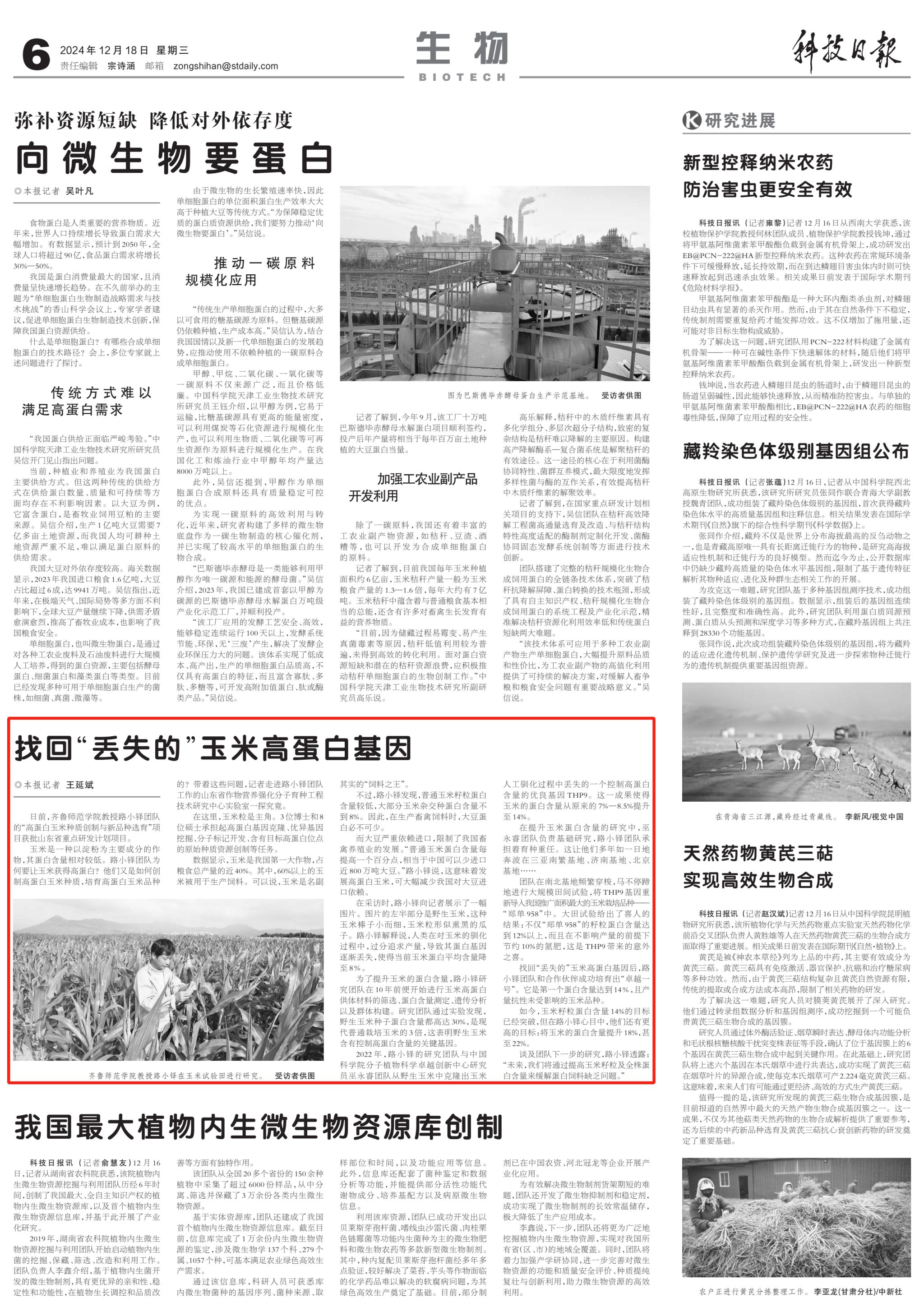 2024年12月18日,《科技日报》在“生物”(第06版)版块以《找回“丢失的”玉米高蛋白基因》为题,报道BEAT365官网玉米研究取得的重大突破成果。
