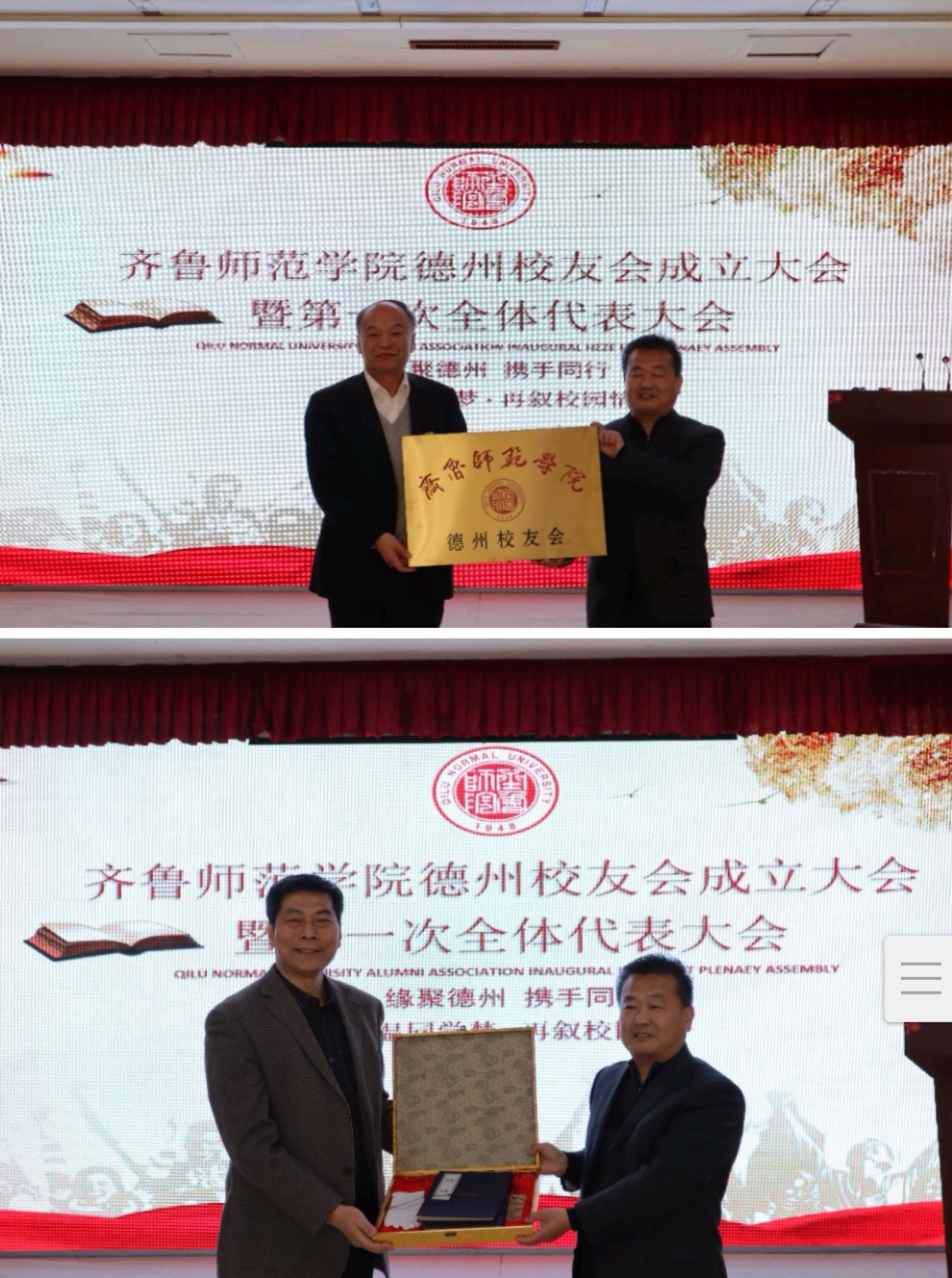 王玉华为BEAT365英国官网德州校友会授牌,张福建代表学校与德州校友会互赠礼物,无论校友与母校相距多远,校友与母校之间的情谊永存。