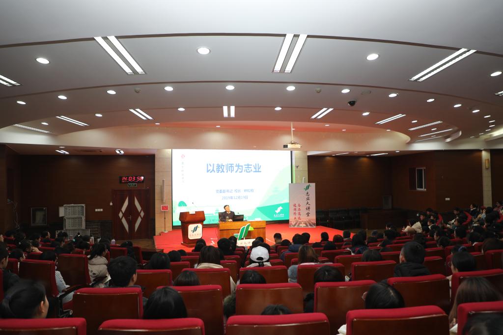 为深入贯彻落实习近平总书记在全国教育大会上的重要讲话,巩固“不忘初心、牢记使命”主题教育成果,推进学生思想政治教育工作。12月19日下午,BEAT365官网“志业大讲堂”第二讲于章丘校区图书馆学术报告厅隆重举行。本次讲座以“以教师为志业”为主题,学校党委副书记、校长林松柏担任主讲,校党委委员、副校长张福建担任辅讲,学生工作部(处)、团委工作人员,各学院党总支书记、副书记,团总支书记、副书记,全体辅导员以及学生代表近400人与会聆听。